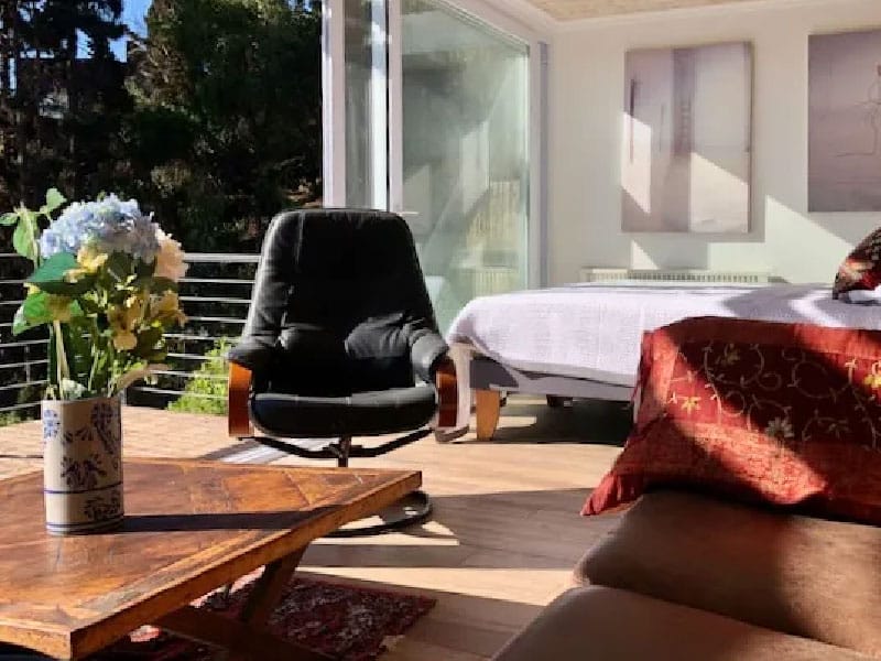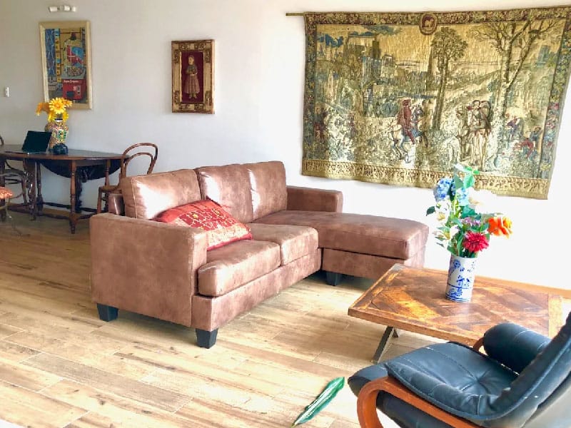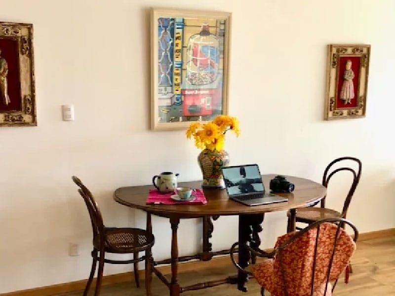 Tiene una cama super king, living comedor, con mesa de trabajo. Un sofá que eventualmente puede ser usado para dormir. Decorado con arte del propietario. Contiene una kitchenette equipada que te permite cocinar tus menú preferidos y